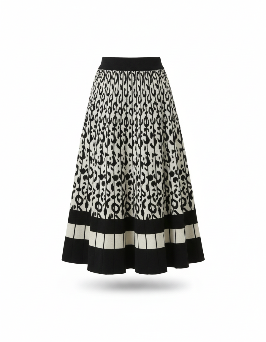 Cette jupe présente un motif léopard noir et blanc sur l'ensemble de son tissu tricoté. Elle est conçue avec des plis et une coupe évasée jusqu'à mi-mollet.