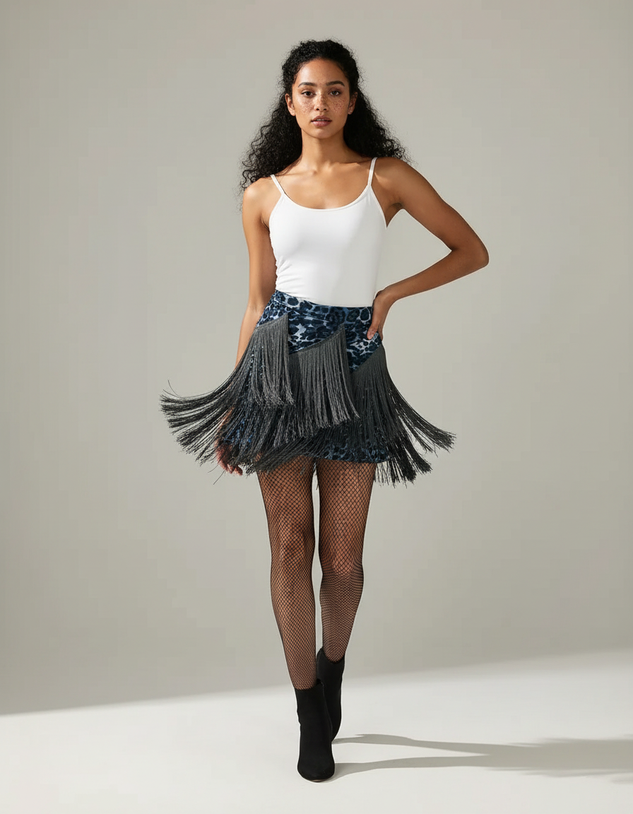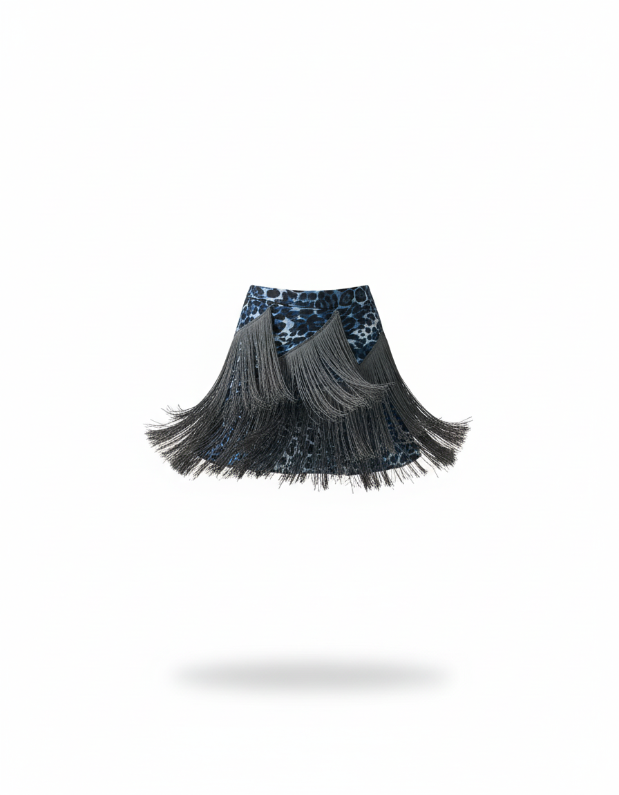 Découvrez notre jupe unique combinant un imprimé léopard bleu et des franges dynamiques, parfaite pour ajouter une touche d'originalité à votre garde-robe.