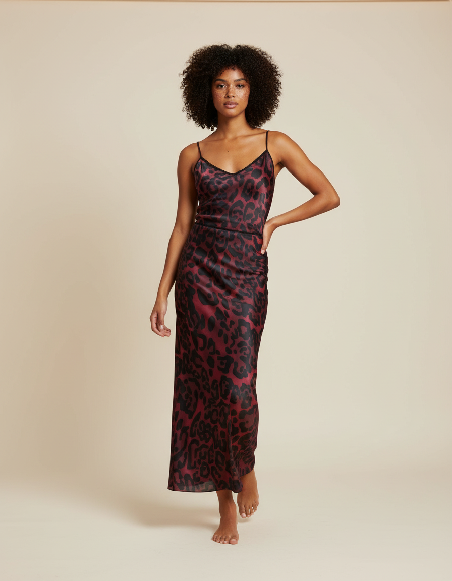 Adoptez un look audacieux et raffiné avec notre jupe léopard bordeaux satinée, parfaite pour toutes les occasions.