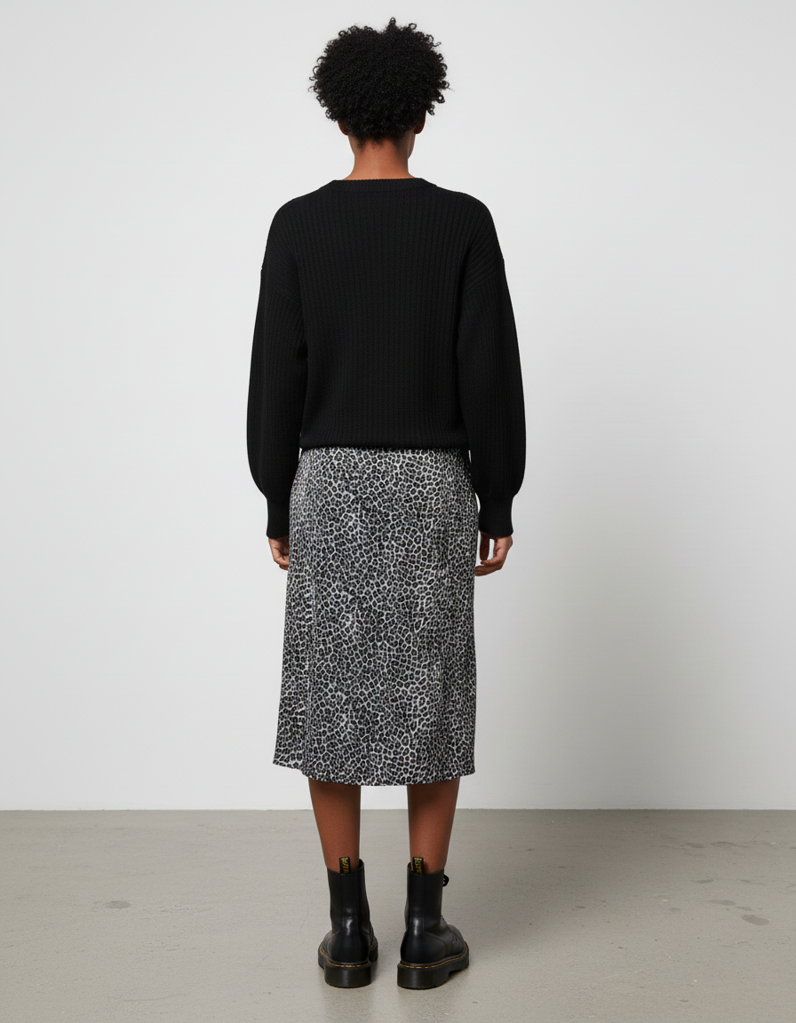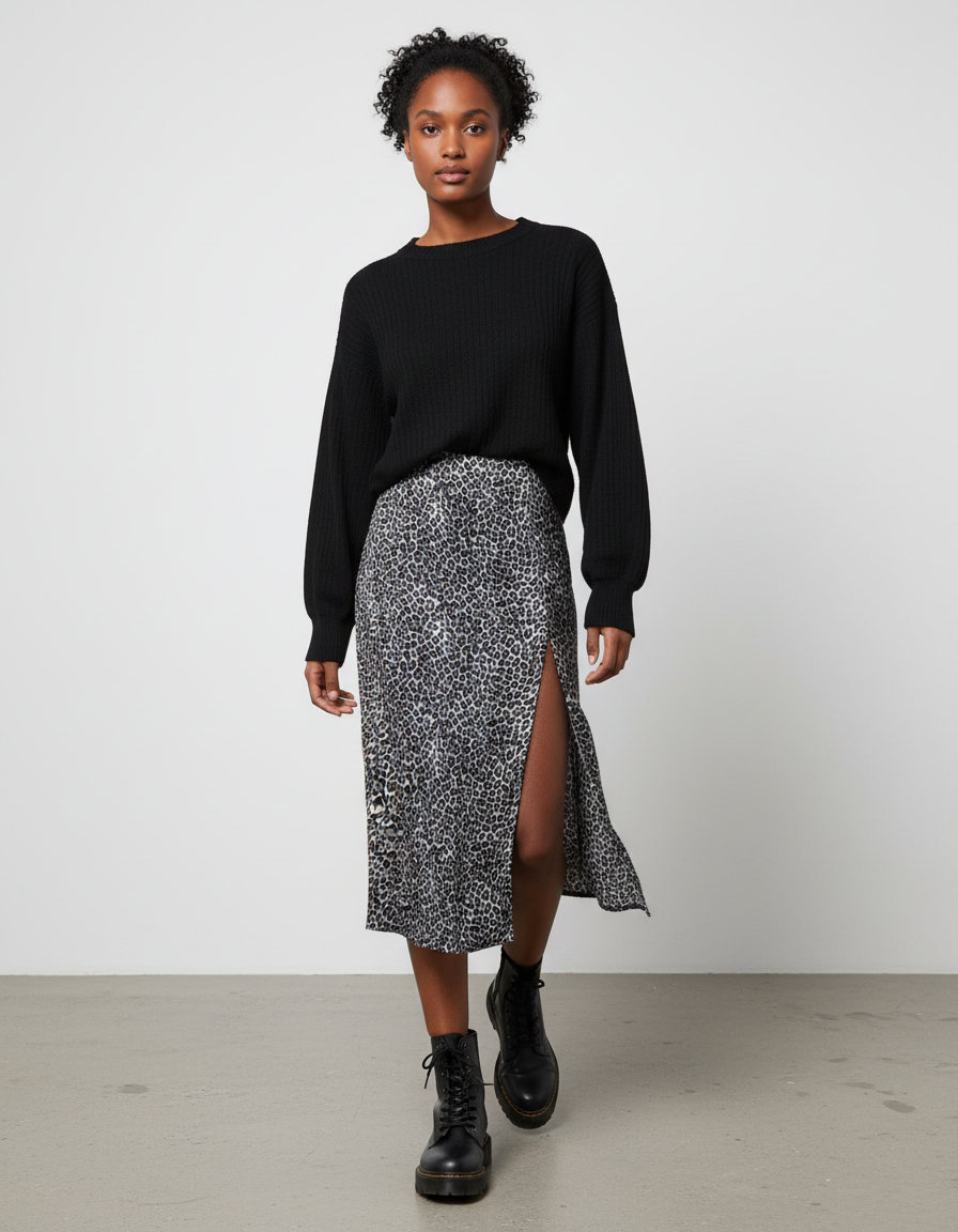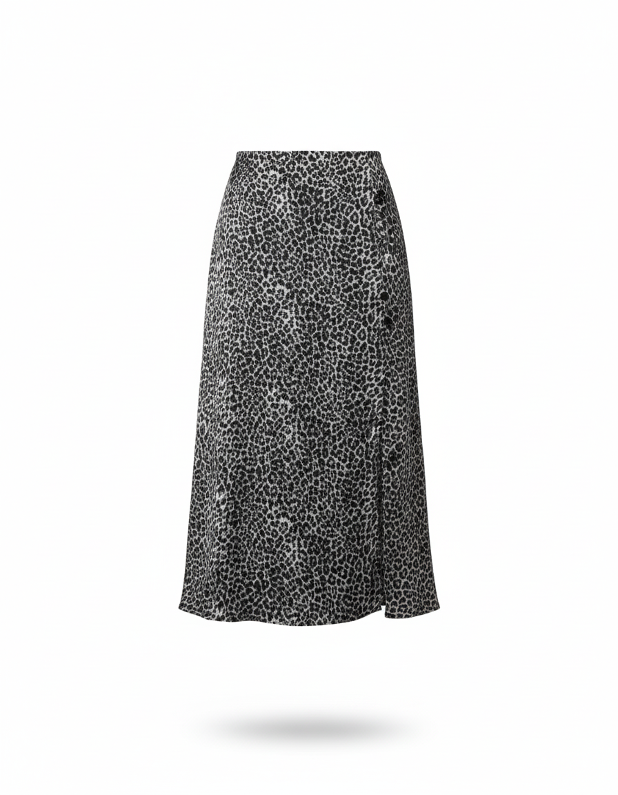 La jupe présente un imprimé léopard, une coupe midi et une fente latérale. Des boutons sont visibles le long d'un côté de la jupe.