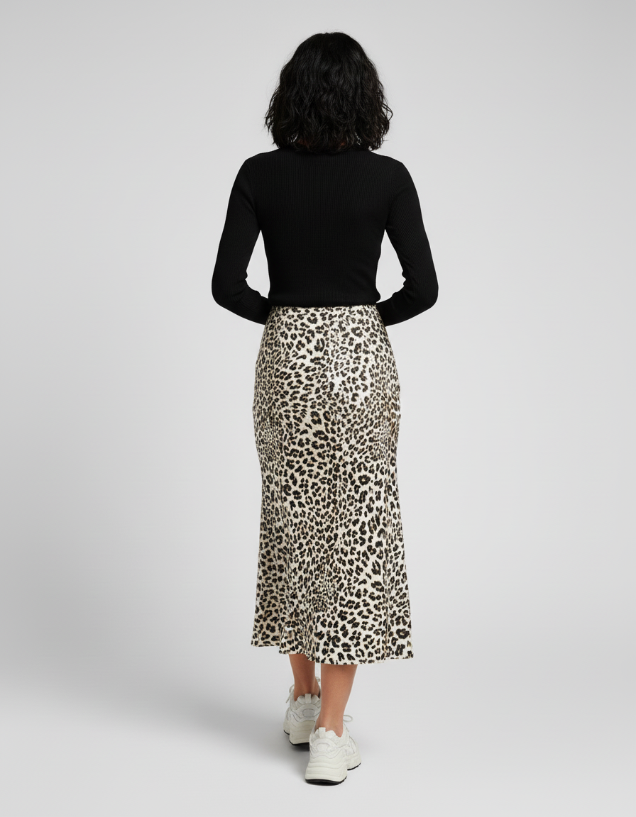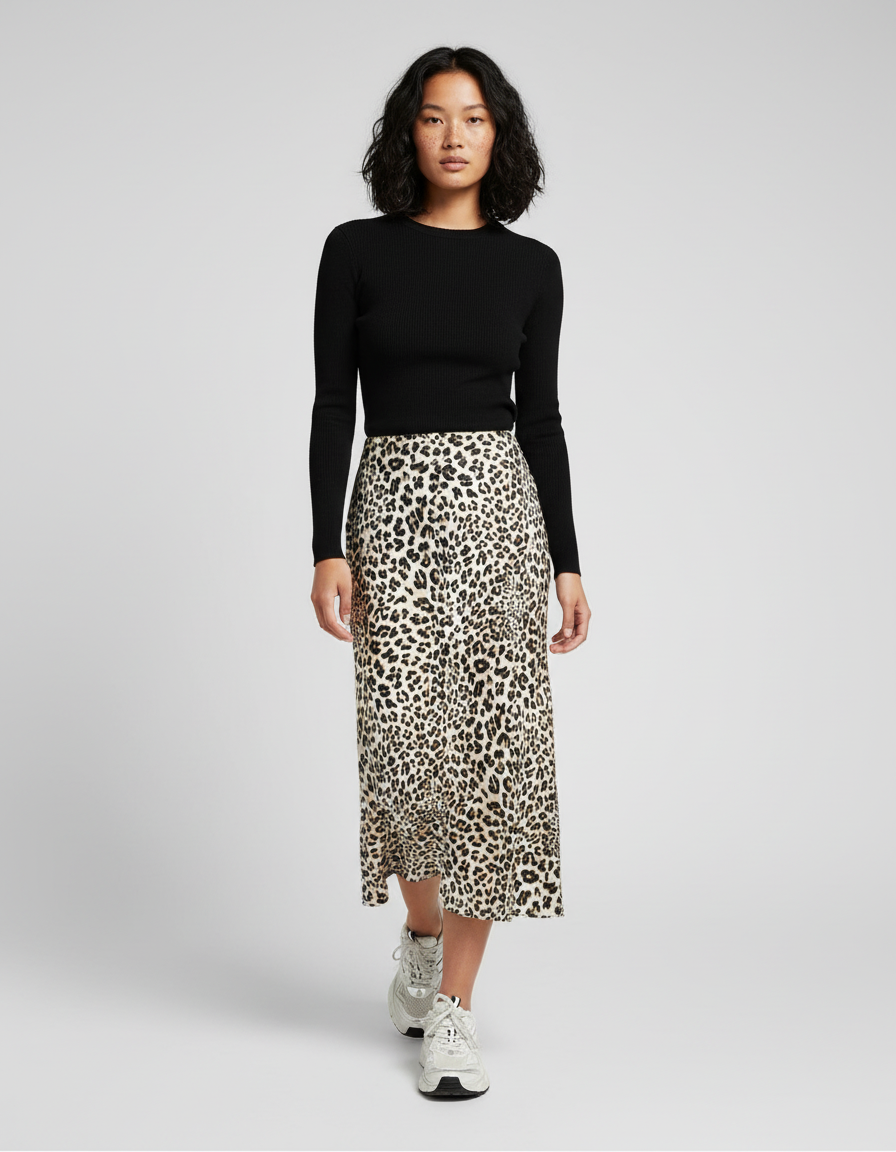 Adoptez un look tendance et confortable avec cette jupe midi fluide à imprimé léopard, parfaite pour toutes les occasions.