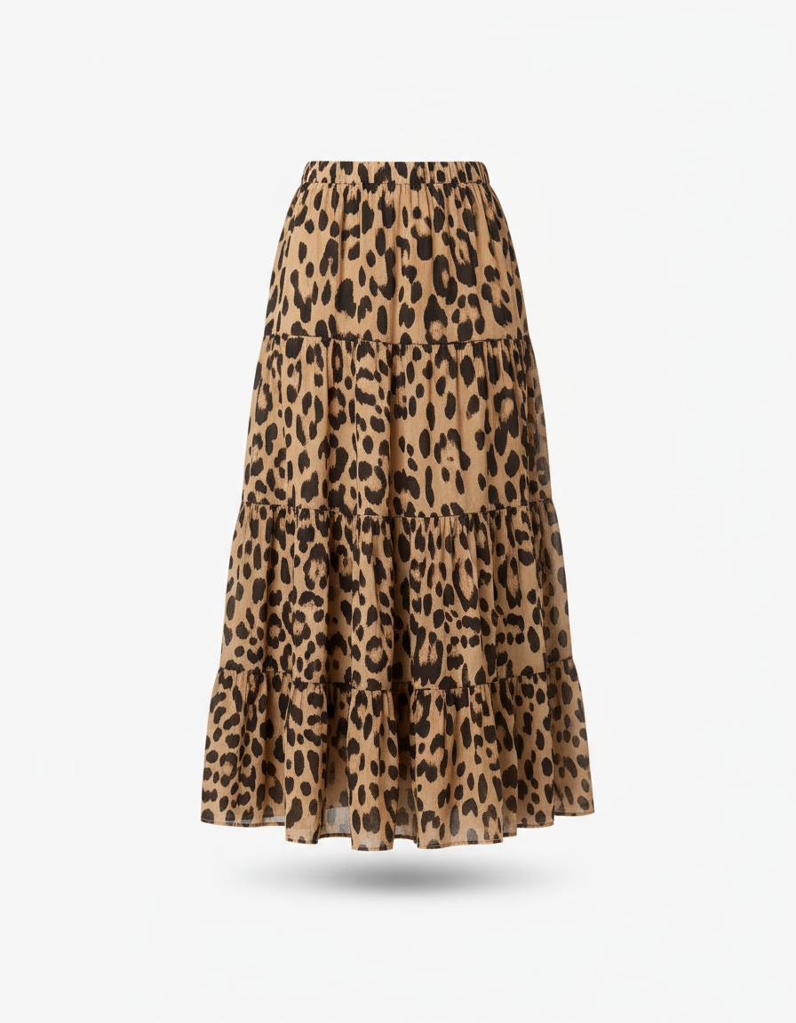 Cette jupe longue présente un motif léopard intégral sur un tissu léger. Elle se caractérise par une coupe évasée avec des volants étagés.