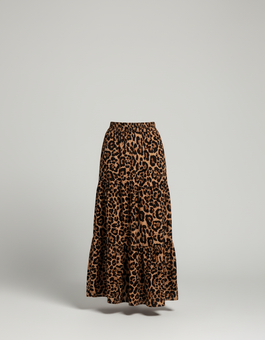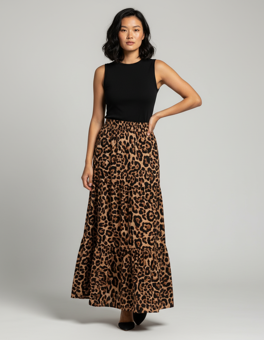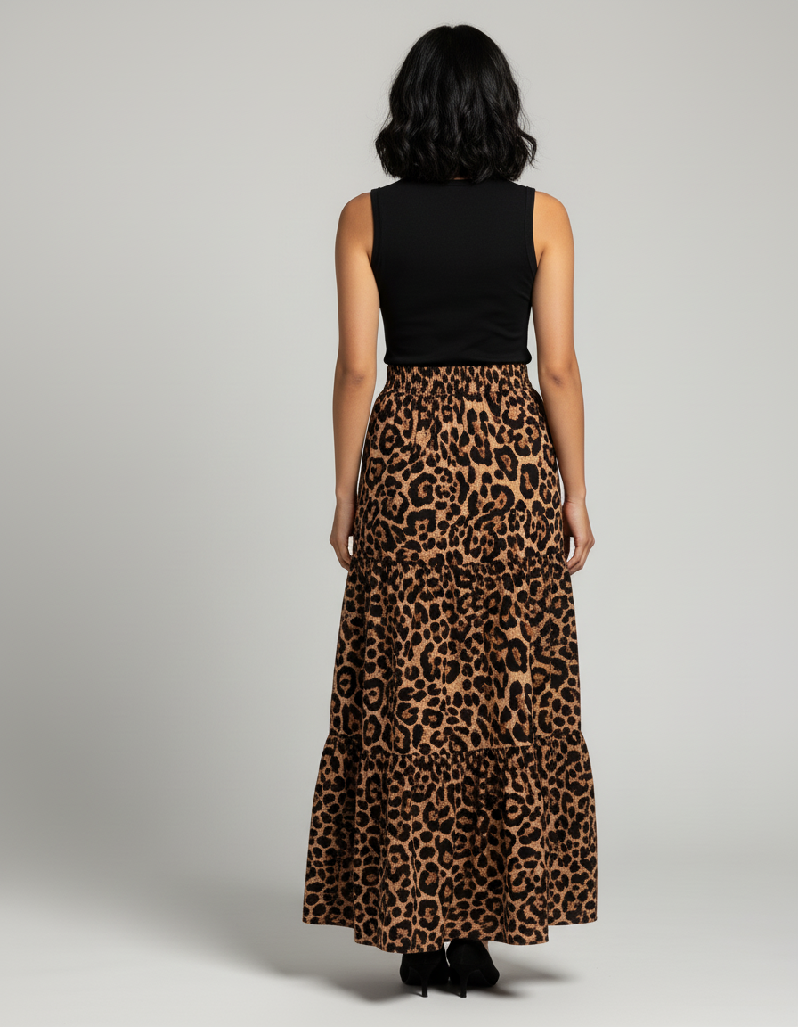 Cette jupe longue léopard à volants est l'incarnation du style bohème chic et de la fluidité.