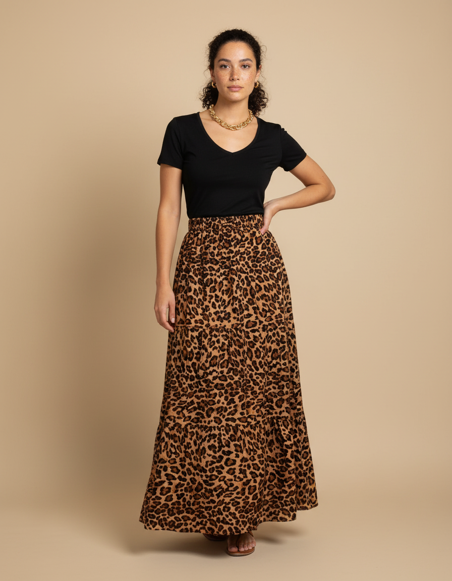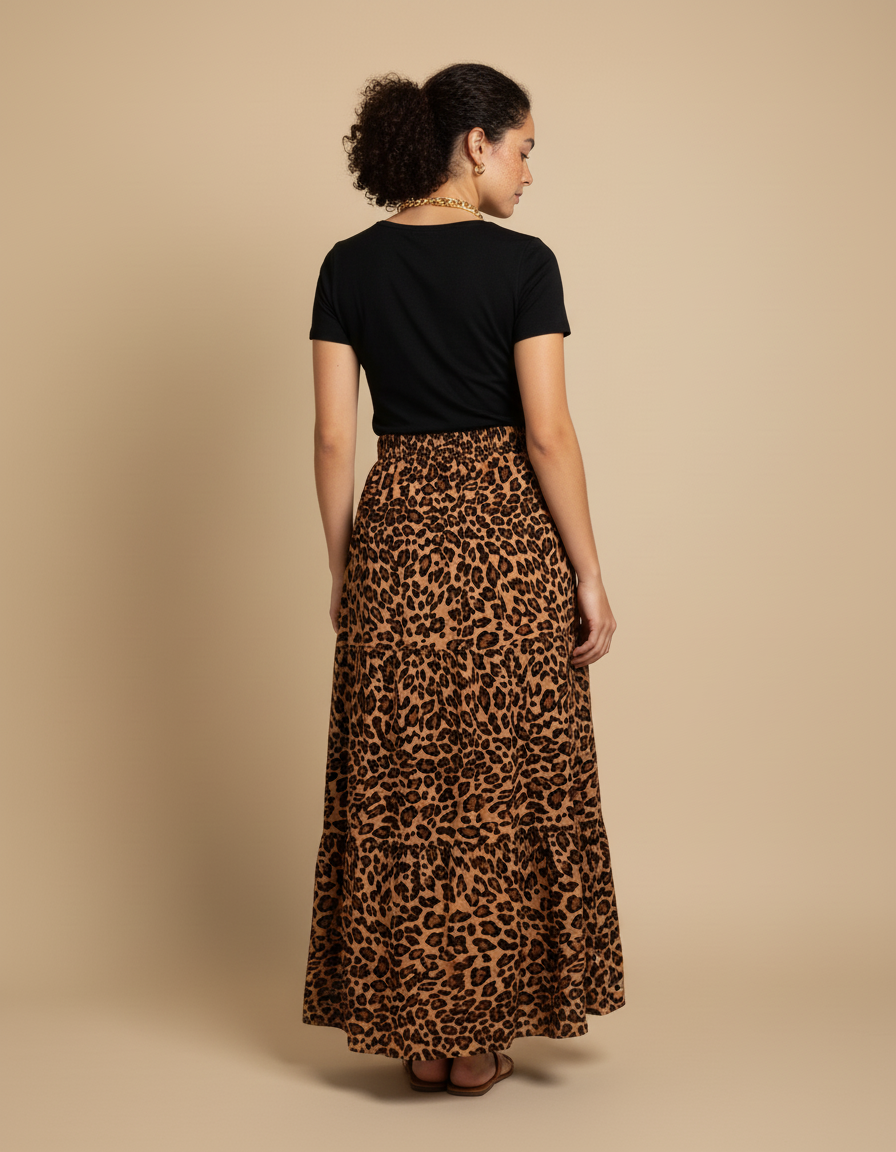 Adoptez un look tendance et confortable avec notre jupe longue fluide à imprimé léopard.