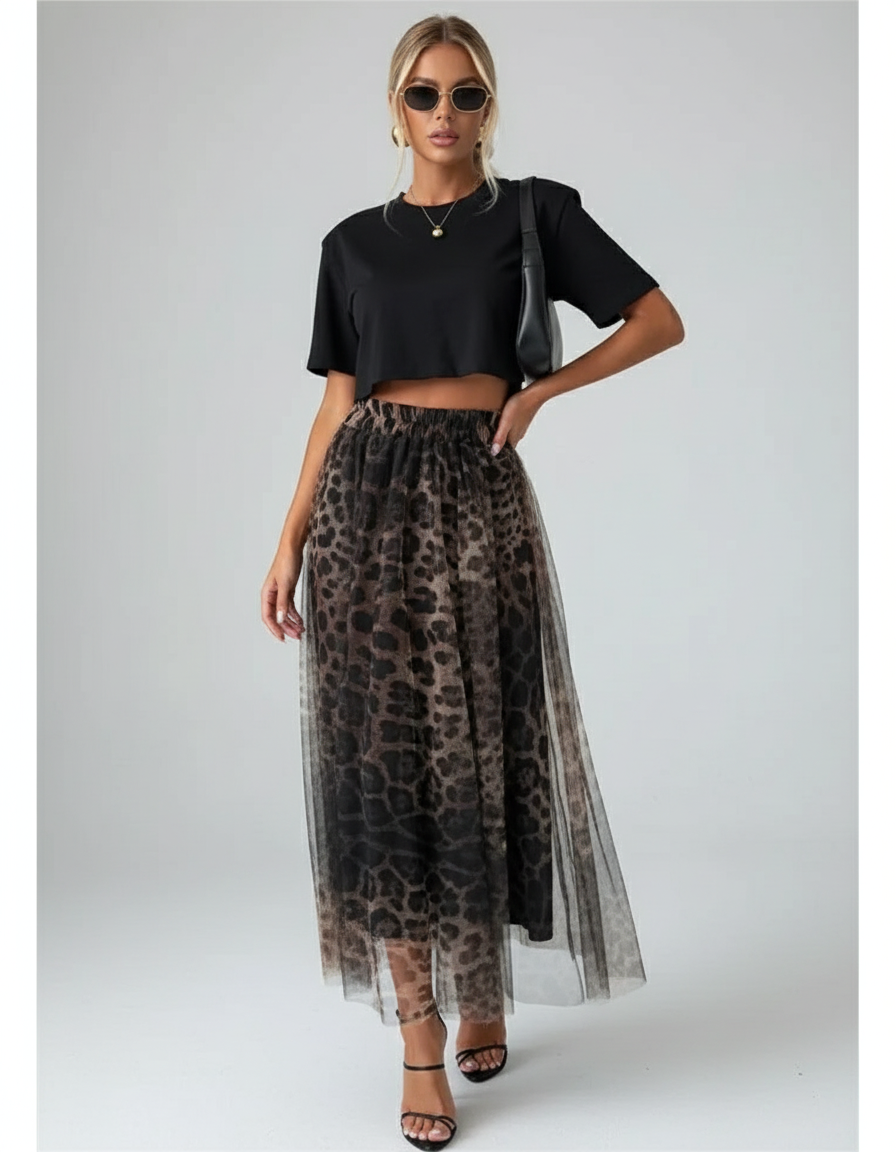 Découvrez la versatilité inégalée de notre Jupe Léopard Maille Longue Plissée, une pièce maîtresse qui transcende les codes. Pour une sortie chic, associez-la à un crop top noir épuré et des sandales fines à talons, complétant le look avec une pochette élégante. En journée, osez la décontraction sophistiquée en la mariant à un simple t-shirt blanc et des baskets immaculées, ou ajoutez une touche rock avec un perfecto en cuir. Son imprimé léopard, intemporel et audacieux, s'adapte à toutes vos envies, du brunch entre amies à une soirée mondaine.