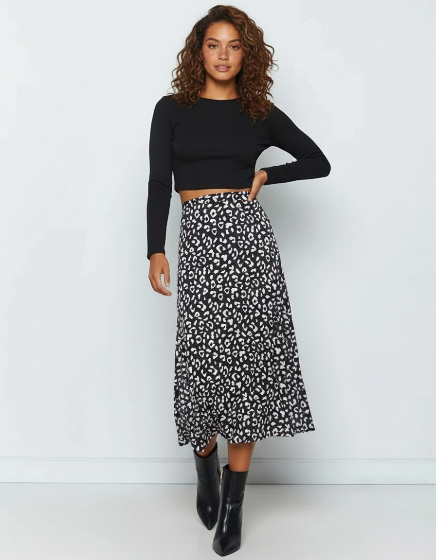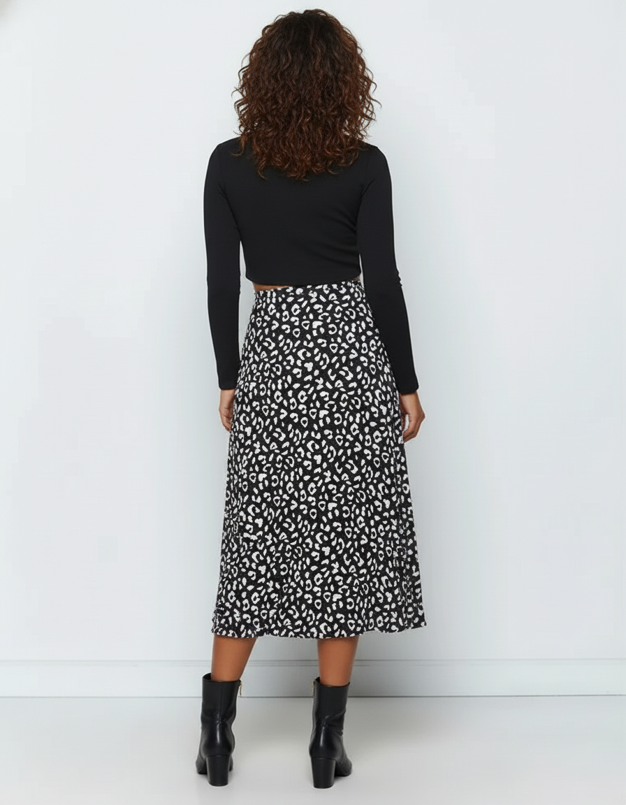 Adoptez un style chic et intemporel avec notre Jupe Léopard Noire Fluide.