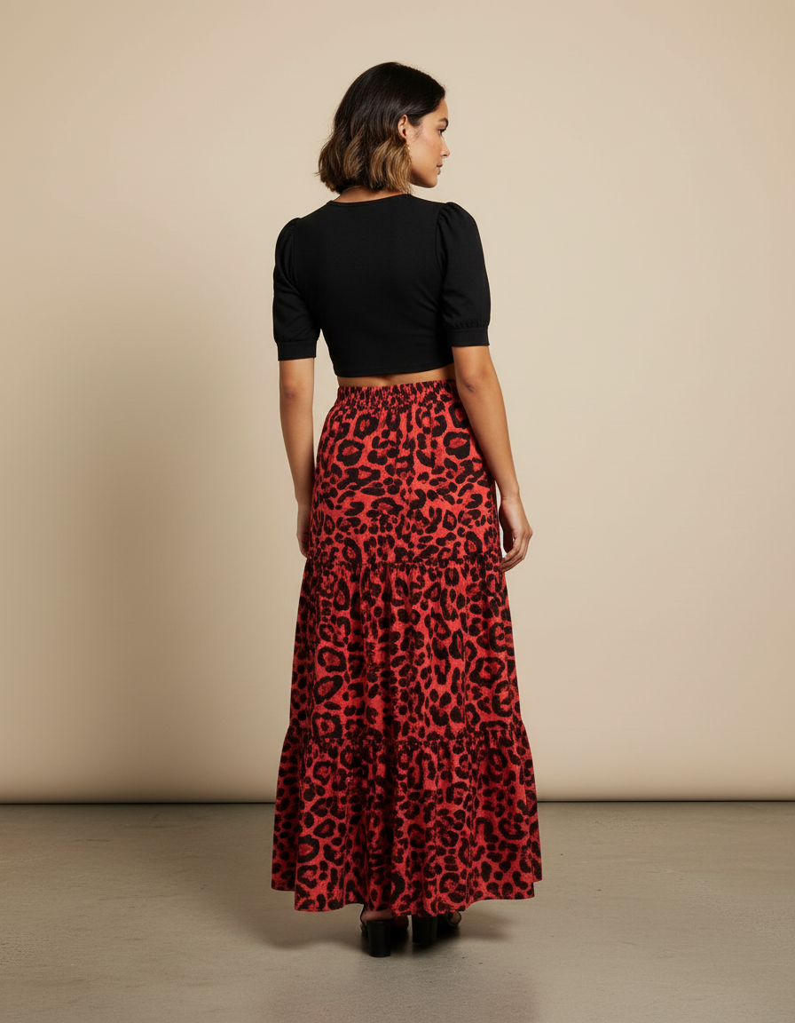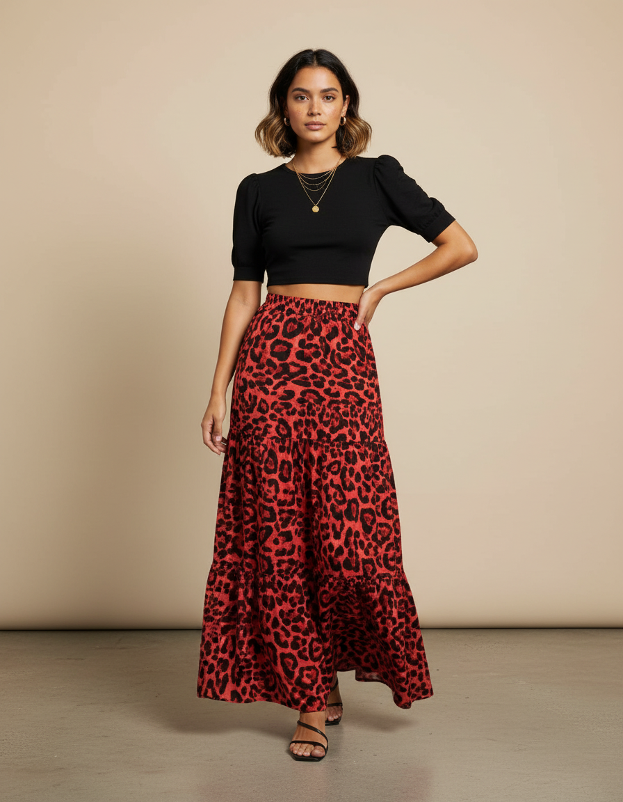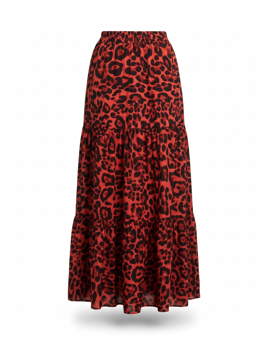Jupe Léopard Rouge À Volants Fluide : L'Élégance Bohème Audacieuse