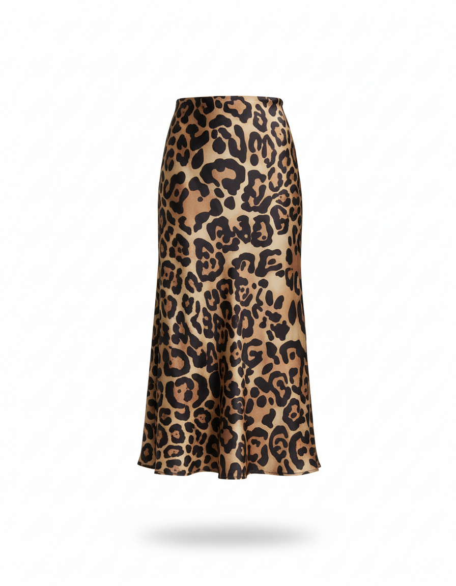 Adoptez un look audacieux et sophistiqué avec notre jupe longue satinée à imprimé léopard, parfaite pour toutes les occasions.