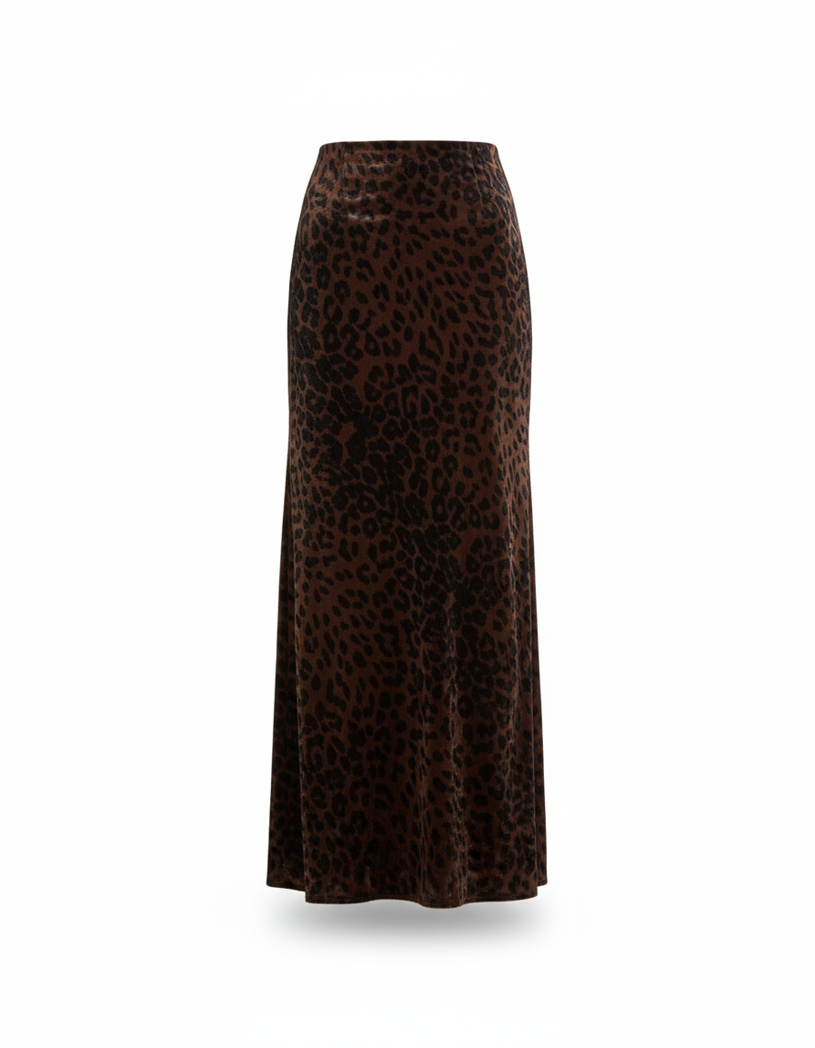 Adoptez un style audacieux et sophistiqué avec notre jupe longue en velours imprimé léopard.