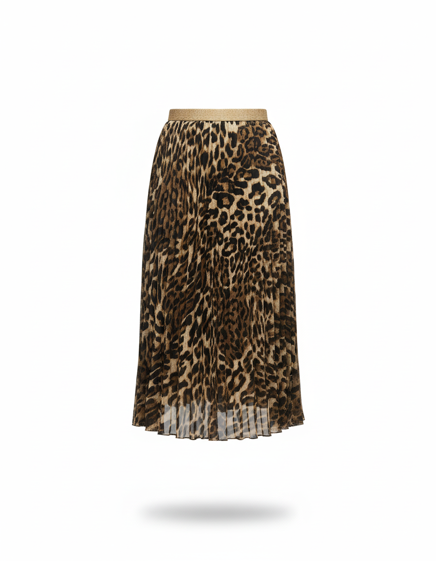 Affirmez votre style avec la Jupe Leopard Voile, une pièce maîtresse qui incarne l'audace chic et la sophistication intemporelle. Conçue en voile léger et délicatement plissé, cette jupe fluide épouse gracieusement chaque mouvement, vous offrant une silhouette aérienne et une allure irrésistible. Le motif léopard emblématique, revisité avec une subtilité moderne, apporte une touche de caractère à votre garde-robe sans jamais sacrifier l'élégance. Son élastique doré à la taille souligne la finesse de votre silhouette, ajoutant un détail luxueux et raffiné qui fait toute la différence.